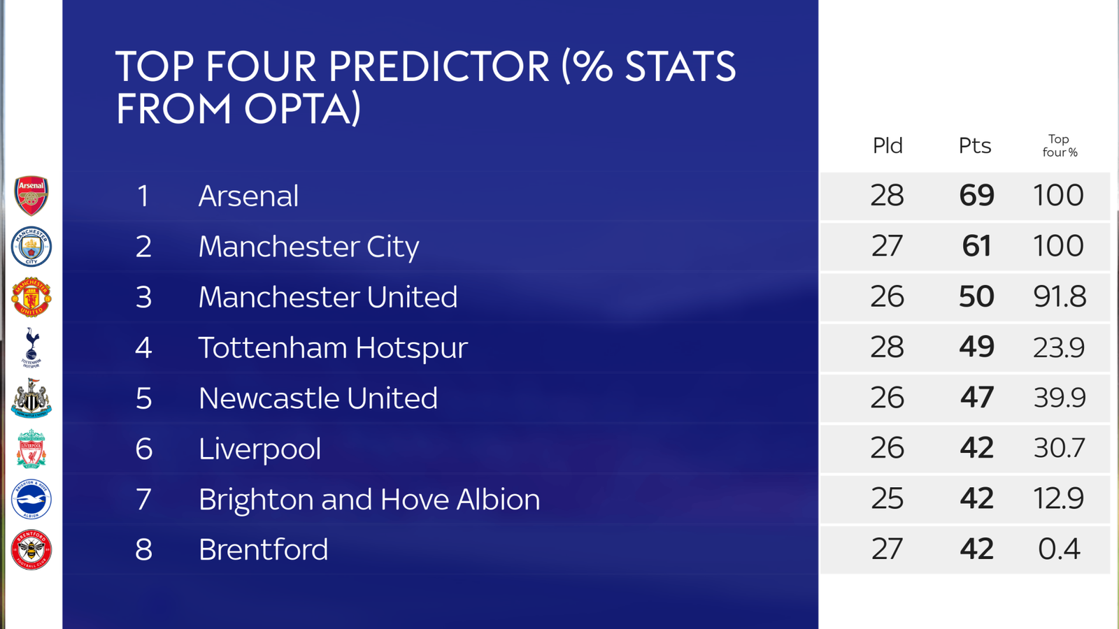 The two teams below Tottenham, Liverpool and Newcastle, seem to have a better chance of securing the fourth spot on the table, due to the two games in hand they have over Spurs.